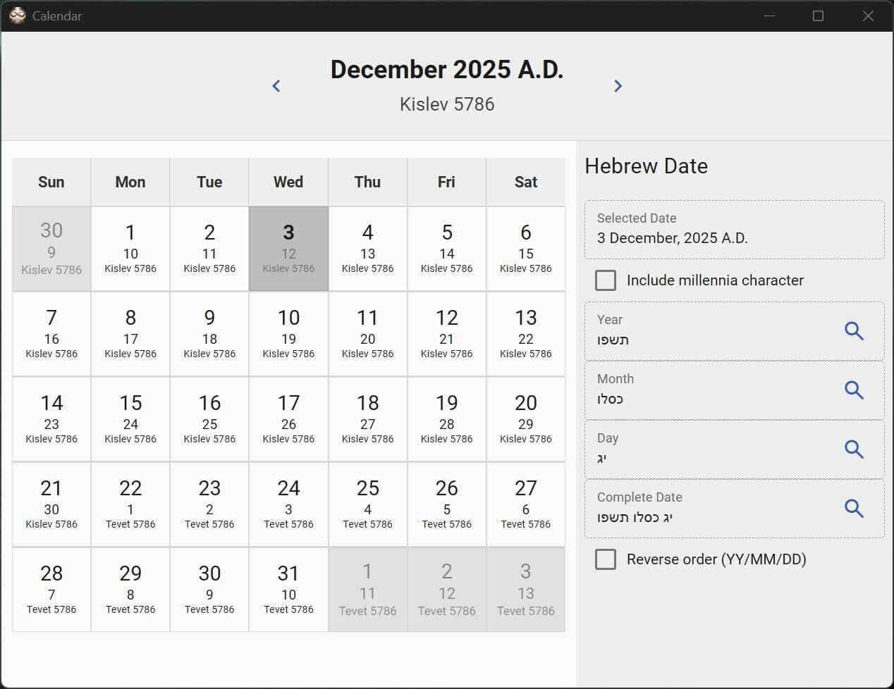 Clicking on the Gregorian or Hebrew date at the top header will open a year and month picker for quick navigation. When the Hebrew picker is open, the numeric date can be typed directly for quicker navigation if moving through several years at once is needed.